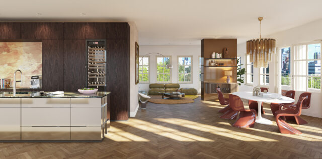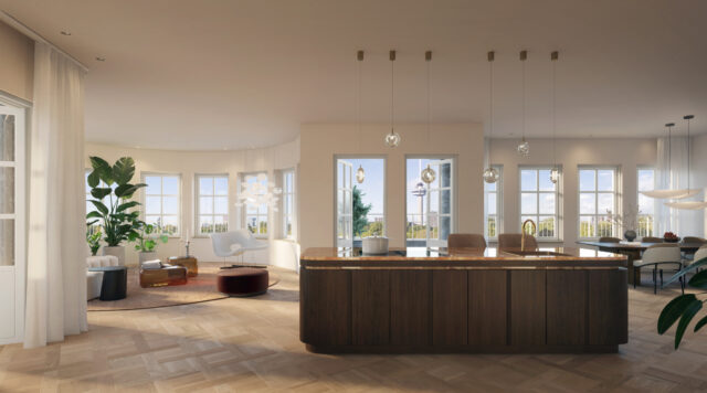 Het historische karakter van het gebouw blijft nadrukkelijk aanwezig in de transformatie. De grote raampartijen, Franse balkons en terrassen verbinden de woningen met Het Park, de Maas en de skyline.